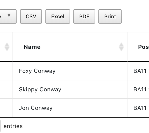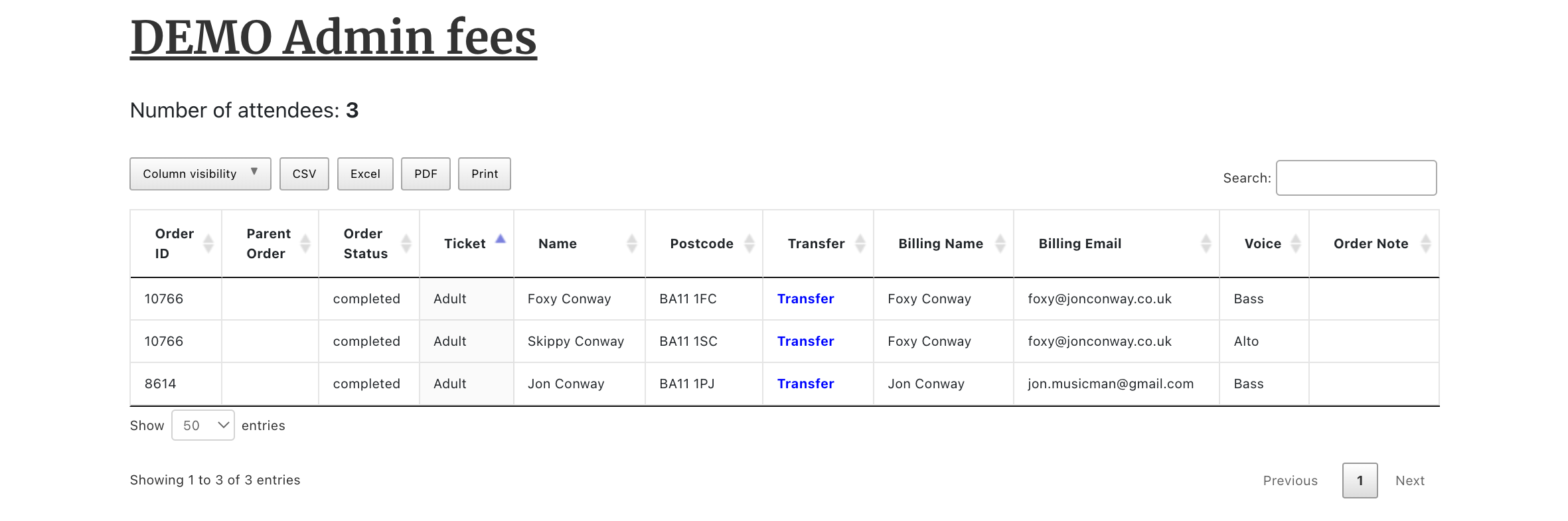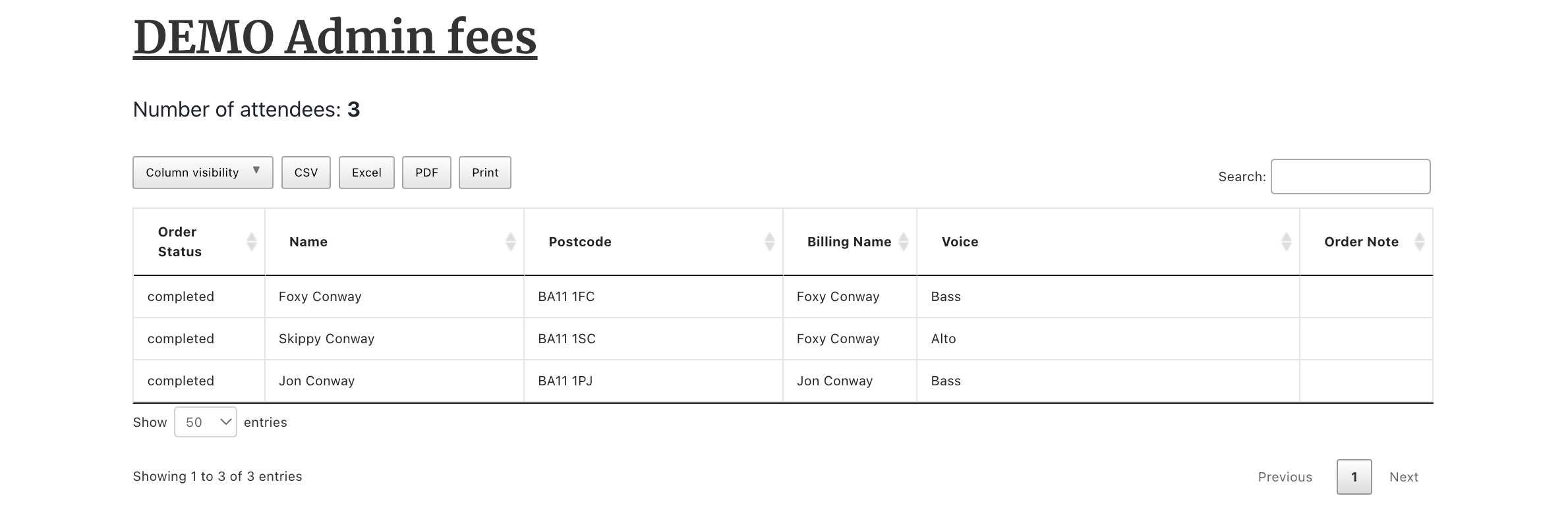 The Buttons CSV, Excel, PDF and Print allow you to download/print the attendee table as displayed. However before you do this, you may want to hide some unwanted columns and re-order the table.