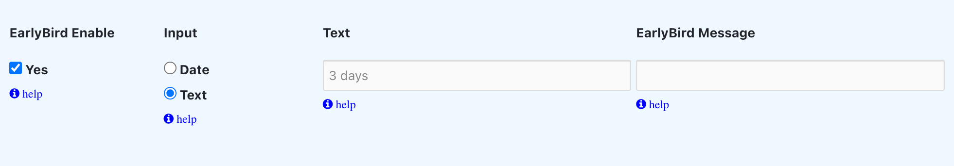 Select Text if you want to specify a description of how long before the event the EarlyBird expires, eg 1 day, 2 weeks, 1 month, 12 hours etc. This will calculate the endtime of the EarlyBird automatically .