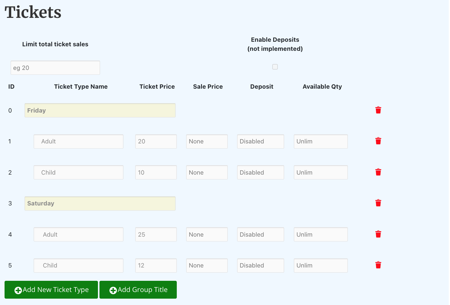 This is confusing to read especially when you have lots of tickets and sections. Now you can specify group titles and your tickets can have the SAME NAME (eg Adult, Child) as they are now associated with the Group Title.