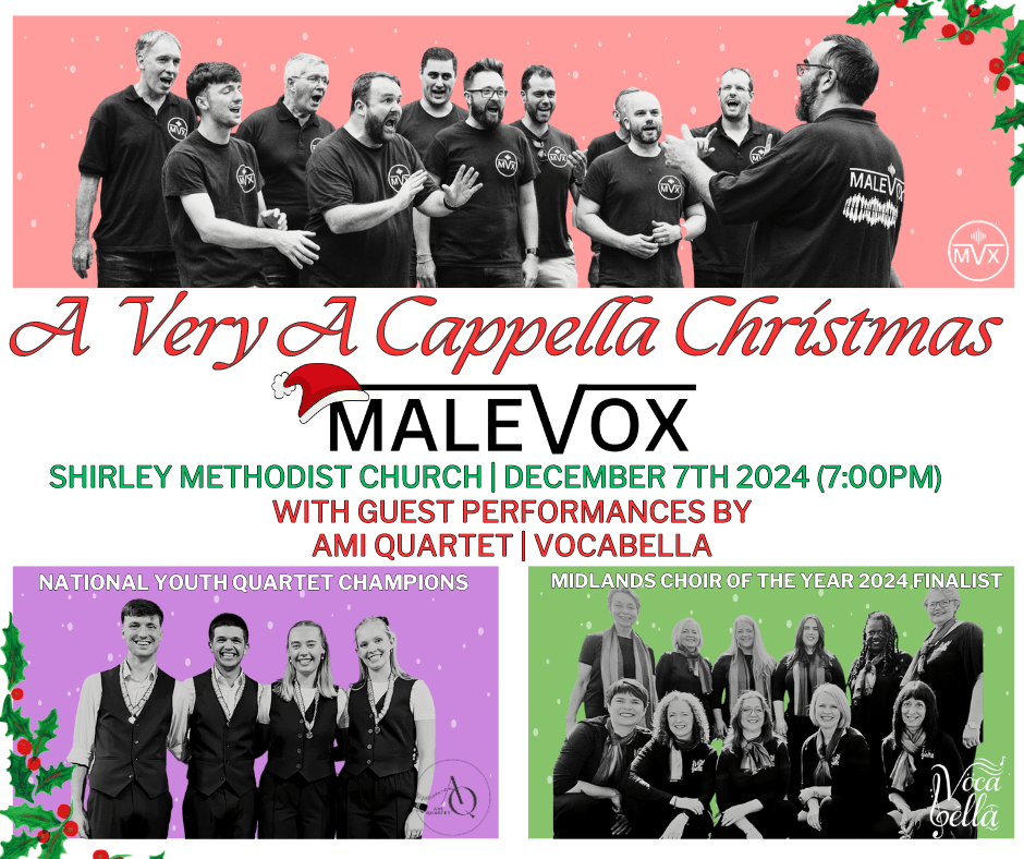 Join MaleVox (Midlands Choir of The Year 2024), as we bring you a night of festive tunes and close-harmony barbershop singing in Shirley Methodist Church! You can look forward to some choral and modern harmonies, music from stage and screen, some iconic jazz/pop tunes and, of course, a generous helping of Christmas songs to celebrate the season!