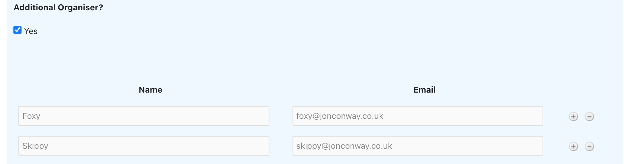 This event has ‘Foxy’ and ‘Skippy’ added as organisers.