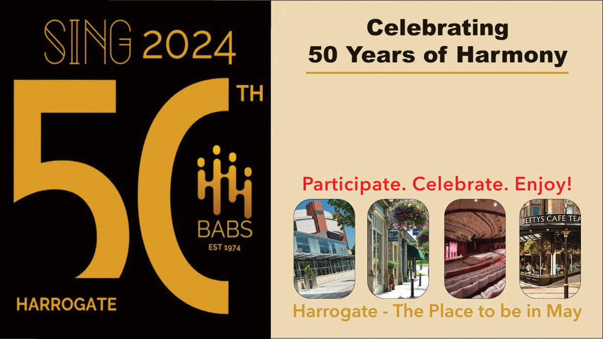 We are delighted to invite you to join us in Harrogate from the 23rd to the 26th May 2024 to celebrate Sing2024 and BABS’ momentous 50th anniversary year!